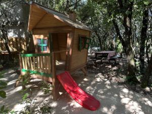 En extérieur à l’ombre, structure accro enfants, Slack-line, draisiennes, trottinettes, terrain de pétanque (nous fournissons les boules) et pour la détente et le repos, des assises confortables ou des hamacs. Très amusant aussi le petit village de maisons en bois biscornues.